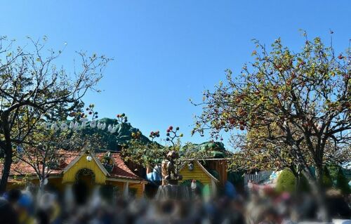 ミッキーの家とミートミッキーの 前の噴水周辺。 ヒメリンゴの実が 色づいています。 真っ赤でツヤツヤな 小さなりんごたちが コレでもかというほど 大量に実ってる風景は圧巻です。 角度を変えてみてみると ドナルドのボートの かわいい煙突が 「あ〜ん」と…