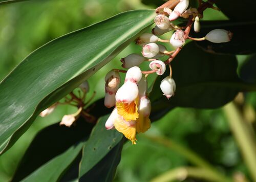 アリエルのグリーティンググロット。 いまはお休み中ですが その入り口付近では… 月桃(ゲットウ)の 花が咲いています。 蕾が桃のような 形をしているので この名前になったのだとか。 マーメイドラグーンで見ると 桃と言うより 小さなクラゲか ふよふよ漂…
