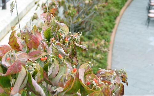 ゴンドリエスナックの 向かいの木。 これはハナミズキの木です。 いまは赤い実がなっています。 花はヤマボウシにそっくりですが 実はぜんぜん似ていないのが不思議です。 flowertdr.hatenablog.com 赤く色づく葉と ツヤツヤの赤い実。 気温的には まだ暑い…