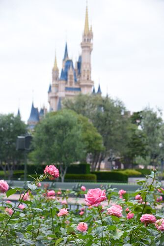 シンデレラ城の周りで咲く ピンクのバラ。 桜のような淡い色合が美しい 「サクラガスミ」です。 一つの枝からいくつもの花を 咲かせている姿は まるで花束のようですね。 八重咲きなので ひとつひとつの花も とっても華やか。 お城を囲むバラたちという 夢の…