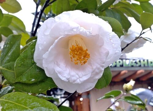 ジュラシックアウトフィッターズの そばで咲く白い花。 八重咲の真っ白な 立派な花です。 まだ背の低い木なので 目線が近く すぐそばでこの美しい 椿の花を見られますよ。