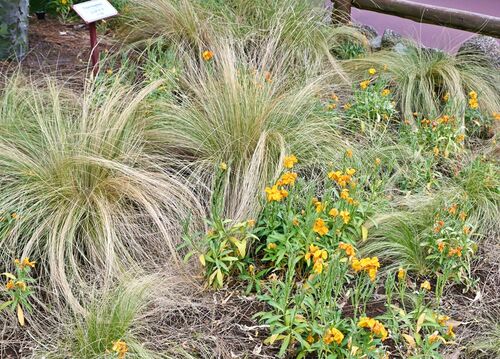 フロンティアウッドクラフトの 看板の下の植物たち。 ワサワサと生える 細長い葉はカレックス。 枯れてるわけではありません。 そばで咲くのは 黄色いチェイランサスです。 ウエスタンランド 荒野を思わせる雰囲気を 花壇で表現するなんて 発想が素晴らしい…
