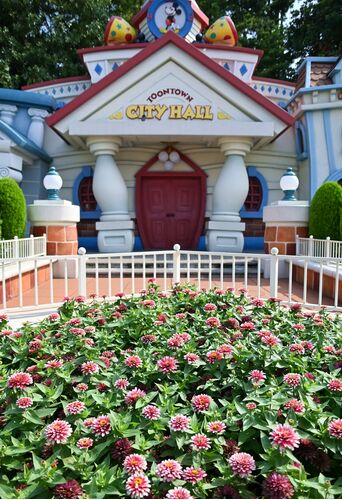 トゥーンタウン シティホール前で咲くのは ジニアです。 中でもスウィズルチェリー アンドアイボリーという品種と思われます。 咲き始めはこのような姿ですが 咲き進むに連れ黄色い中心部が このような姿になり お花の中に小さなお花が 咲いている状態になっ…