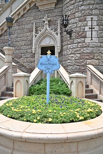 シンデレラ城の下にある ガラス工芸のお店 「ガラスの靴」。 その案内看板の周りは ちょっとした花壇になっています。 黄色い花は松葉牡丹 (マツバボタン)です。 花びらを見ると ほんのりピンクの線が 入っているのがかわいいですね。 青と紫の花はトレニ…