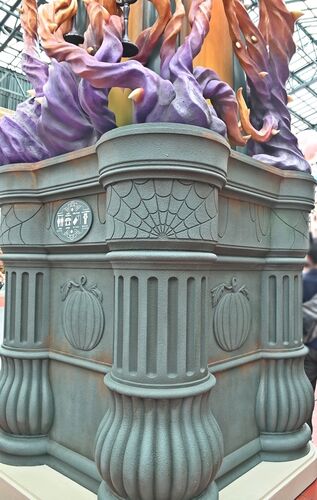 ワールドバザールのハンギング。 朱色のようなオレンジのような かわいいお花が咲いています。 これはベゴニアです。 ミニバラのような雰囲気があって とても素敵ですね。 後ろに写ってる柱のバナーとも 色合いがマッチしています。 よく見るとカラスがゲス…