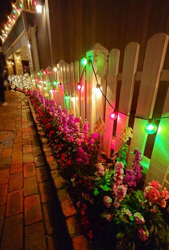 ケープコッドクックオフの 周りを囲む花壇。 咲いているのはかわいらしい 小さなビオラや ストックたちです。 ストックは香りがとてもよいので このあたりを歩いているだけで 咲いているのがわかるほど。 夜になるとライトアップされて こんな景色になります…