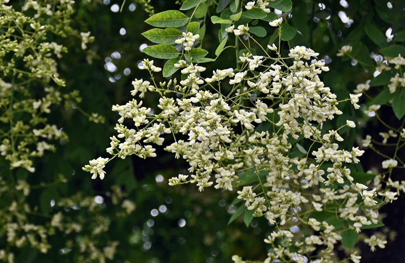 2023-07-20 グルグル ディズニーランド 夏 さ行 木 白 ミニーの家の前にある木は シダレエンジュです。 この木に今 花が咲いています。 クリーム色の可愛い花が 風に揺れる様子が 爽やかな雰囲気です。 真ん中の幹はグルグルと 渦を巻くように伸びていて 迫力がありますね。